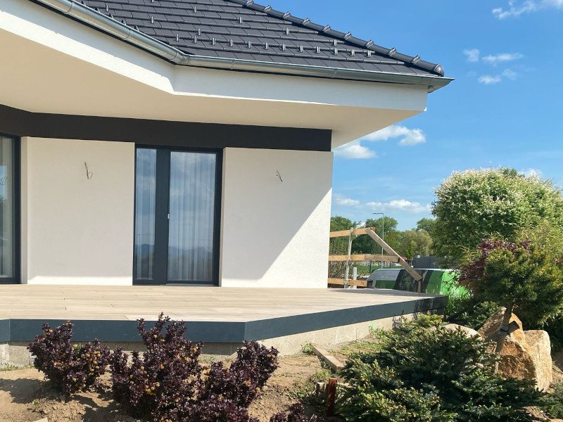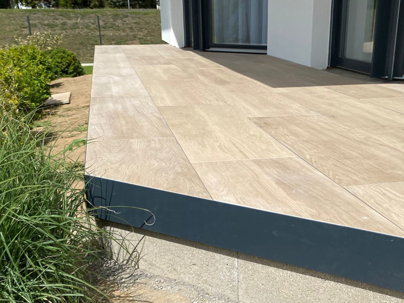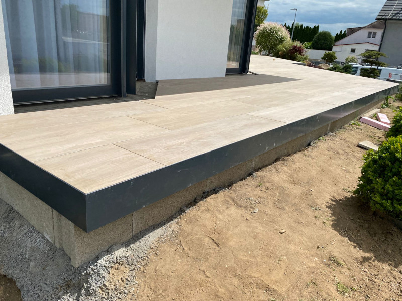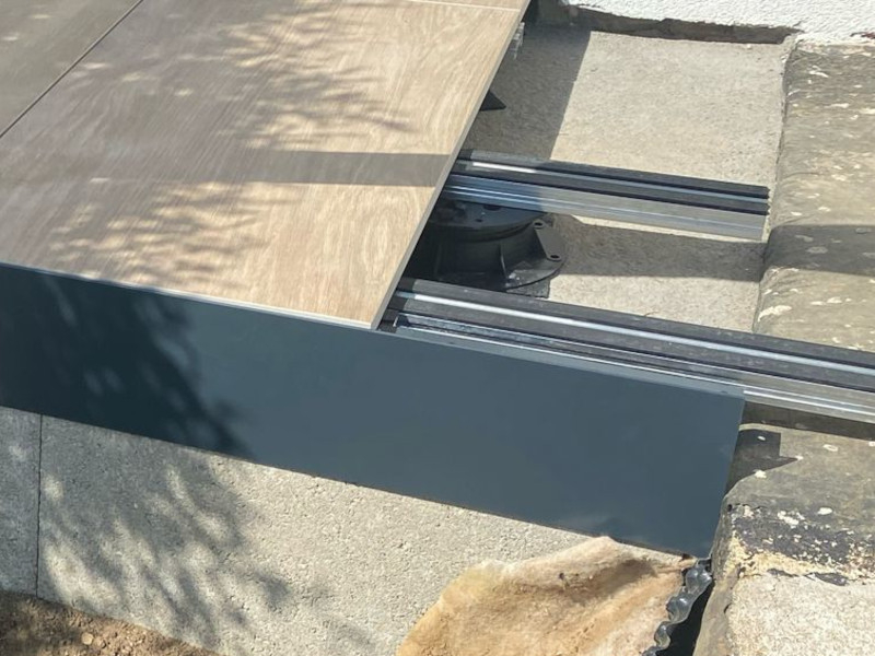 Nový hliníkový profil Buzon U-TFP pro estetické a snadné zakrytí otevřených stran vyvýšené terasy z dlažby na terčích Buzon či E-BRS systému, podepření a zajištění dořezů po obvodu terasy.